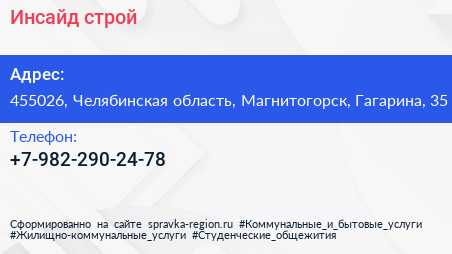 Инсайд строй по адресу 455026, Челябинская область, Магнитогорск, Гагарина, 35 в дальнейшем Организация, размещена в следующих категориях: