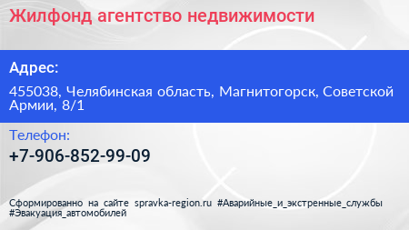 Жилфонд, агентство недвижимости по адресу 455038, Челябинская область, Магнитогорск, Советской Армии, 8/1 в дальнейшем Организация, размещена в следующих категориях: