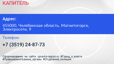 КАПИТЕЛЬ по адресу 455000, Челябинская область, Магнитогорск, Электросети, 9 в дальнейшем Организация, размещена в следующих категориях: