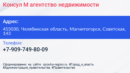 Консул.М, агентство недвижимости по адресу 455030, Челябинская область, Магнитогорск, Советская, 143 в дальнейшем Организация, размещена в следующих категориях: