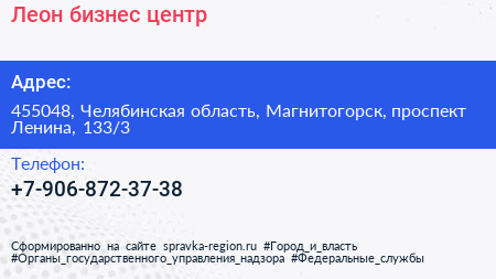 Леон, бизнес-центр по адресу 455048, Челябинская область, Магнитогорск, проспект Ленина, 133/3 в дальнейшем Организация, размещена в следующих категориях: