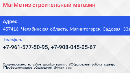 МагМетиз, строительный магазин по адресу 457416, Челябинская область, Магнитогорск, Садовая, 33а в дальнейшем Организация, размещена в следующих категориях: