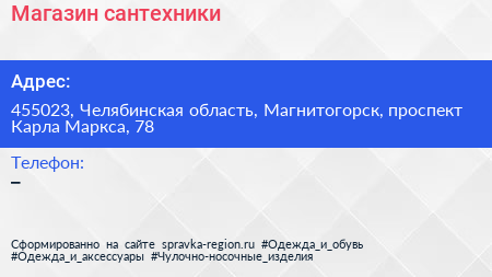 Магазин сантехники по адресу 455023, Челябинская область, Магнитогорск, проспект Карла Маркса, 78 в дальнейшем Организация, размещена в следующих категориях: