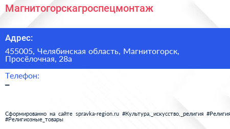Магнитогорскагроспецмонтаж по адресу 455005, Челябинская область, Магнитогорск, Просёлочная, 28а в дальнейшем Организация, размещена в следующих категориях: