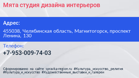Мята, студия дизайна интерьеров по адресу 455038, Челябинская область, Магнитогорск, проспект Ленина, 130 в дальнейшем Организация, размещена в следующих категориях: