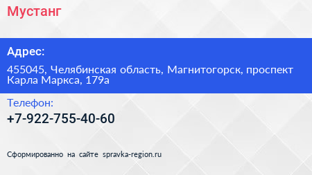Мустанг по адресу 455045, Челябинская область, Магнитогорск, проспект Карла Маркса, 179а в дальнейшем Организация, размещена в следующих категориях: