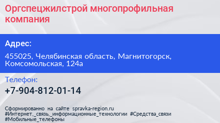 Оргспецжилстрой, многопрофильная компания по адресу 455025, Челябинская область, Магнитогорск, Комсомольская, 124а в дальнейшем Организация, размещена в следующих категориях: