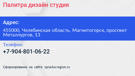 Палитра, дизайн-студия по адресу 455000, Челябинская область, Магнитогорск, проспект Металлургов, 13 в дальнейшем Организация, размещена в следующих категориях: