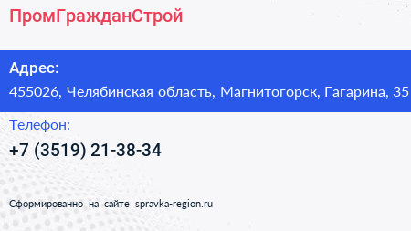 ПромГражданСтрой по адресу 455026, Челябинская область, Магнитогорск, Гагарина, 35 в дальнейшем Организация, размещена в следующих категориях: