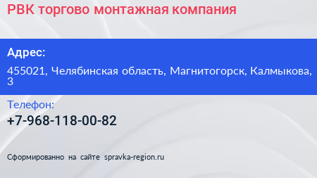 РВК, торгово-монтажная компания по адресу 455021, Челябинская область, Магнитогорск, Калмыкова, 3 в дальнейшем Организация, размещена в следующих категориях: