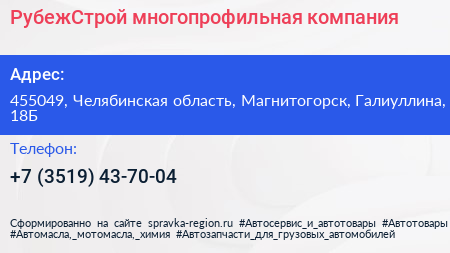 РубежСтрой, многопрофильная компания по адресу 455049, Челябинская область, Магнитогорск, Галиуллина, 18Б в дальнейшем Организация, размещена в следующих категориях: