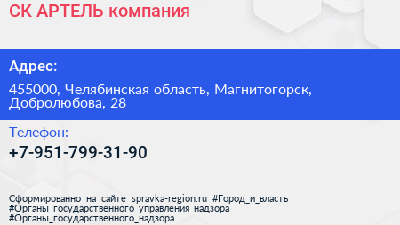 СК АРТЕЛЬ, компания по адресу 455000, Челябинская область, Магнитогорск, Добролюбова, 28 в дальнейшем Организация, размещена в следующих категориях: