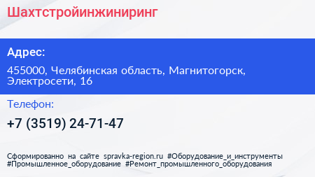 Шахтстройинжиниринг по адресу 455000, Челябинская область, Магнитогорск, Электросети, 16 в дальнейшем Организация, размещена в следующих категориях: