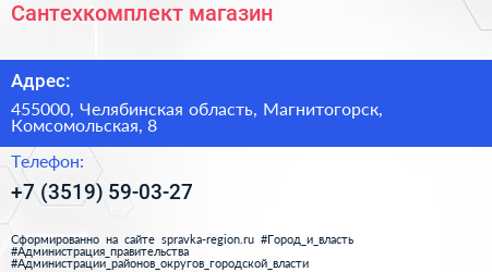 Сантехкомплект, магазин по адресу 455000, Челябинская область, Магнитогорск, Комсомольская, 8 в дальнейшем Организация, размещена в следующих категориях: