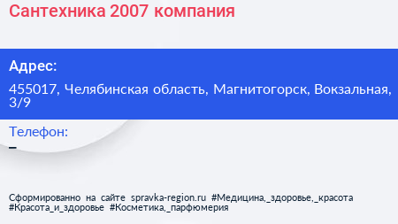 Сантехника 2007, компания по адресу 455017, Челябинская область, Магнитогорск, Вокзальная, 3/9 в дальнейшем Организация, размещена в следующих категориях: