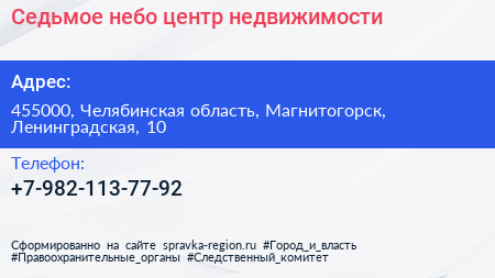 Седьмое небо, центр недвижимости по адресу 455000, Челябинская область, Магнитогорск, Ленинградская, 10 в дальнейшем Организация, размещена в следующих категориях: