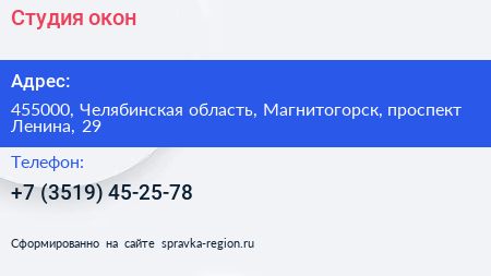 Студия окон по адресу 455000, Челябинская область, Магнитогорск, проспект Ленина, 29 в дальнейшем Организация, размещена в следующих категориях: