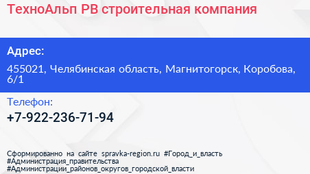 ТехноАльп-РВ, строительная компания по адресу 455021, Челябинская область, Магнитогорск, Коробова, 6/1 в дальнейшем Организация, размещена в следующих категориях: