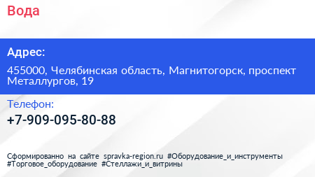 Вода+ по адресу 455000, Челябинская область, Магнитогорск, проспект Металлургов, 19 в дальнейшем Организация, размещена в следующих категориях: