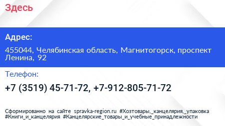 Здесь по адресу 455044, Челябинская область, Магнитогорск, проспект Ленина, 92 в дальнейшем Организация, размещена в следующих категориях: