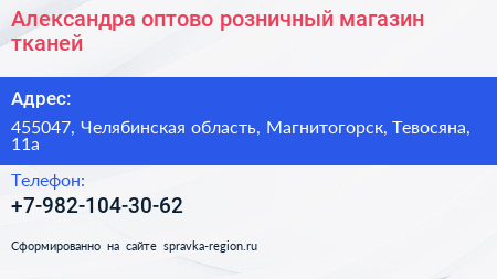 Александра, оптово-розничный магазин тканей по адресу 455047, Челябинская область, Магнитогорск, Тевосяна, 11а в дальнейшем Организация, размещена в следующих категориях: