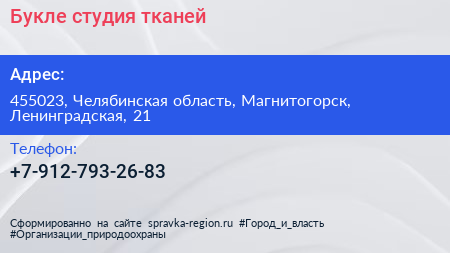 Букле, студия тканей по адресу 455023, Челябинская область, Магнитогорск, Ленинградская, 21 в дальнейшем Организация, размещена в следующих категориях: