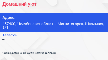 Домашний уют по адресу 457400, Челябинская область, Магнитогорск, Школьная, 1/1 в дальнейшем Организация, размещена в следующих категориях: