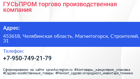 ГУСЬПРОМ, торгово-производственная компания по адресу 453618, Челябинская область, Магнитогорск, Строителей, 31 в дальнейшем Организация, размещена в следующих категориях: