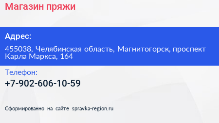 Магазин пряжи по адресу 455038, Челябинская область, Магнитогорск, проспект Карла Маркса, 164 в дальнейшем Организация, размещена в следующих категориях:
