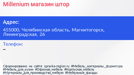 Millenium, магазин штор по адресу 455000, Челябинская область, Магнитогорск, Ленинградская, 26 в дальнейшем Организация, размещена в следующих категориях: