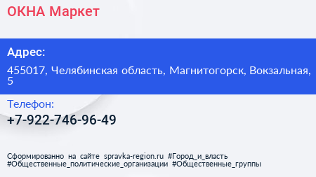 ОКНА Маркет по адресу 455017, Челябинская область, Магнитогорск, Вокзальная, 5 в дальнейшем Организация, размещена в следующих категориях:
