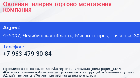 Оконная галерея, торгово-монтажная компания по адресу 455037, Челябинская область, Магнитогорск, Грязнова, 30 в дальнейшем Организация, размещена в следующих категориях:
