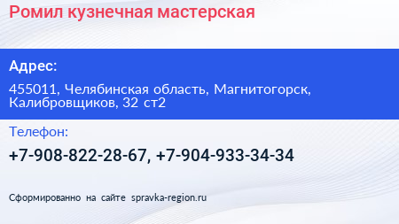 Ромил, кузнечная мастерская по адресу 455011, Челябинская область, Магнитогорск, Калибровщиков, 32 ст2 в дальнейшем Организация, размещена в следующих категориях: