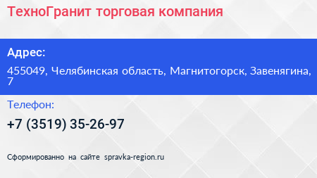 ТехноГранит, торговая компания по адресу 455049, Челябинская область, Магнитогорск, Завенягина, 7 в дальнейшем Организация, размещена в следующих категориях: