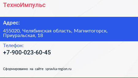 ТехноИмпульс по адресу 455020, Челябинская область, Магнитогорск, Приуральская, 18 в дальнейшем Организация, размещена в следующих категориях:
