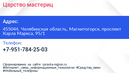Царство мастериц по адресу 455044, Челябинская область, Магнитогорск, проспект Карла Маркса, 95/1 в дальнейшем Организация, размещена в следующих категориях: