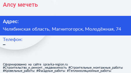 Алсу, мечеть по адресу Челябинская область, Магнитогорск, Молодёжная, 74 в дальнейшем Организация, размещена в следующих категориях:
