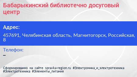 Бабарыкинский библиотечно-досуговый центр по адресу 457691, Челябинская область, Магнитогорск, Российская, 8 в дальнейшем Организация, размещена в следующих категориях: