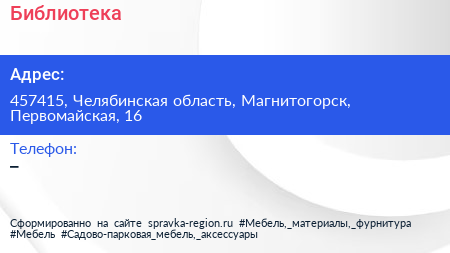 Библиотека по адресу 457415, Челябинская область, Магнитогорск, Первомайская, 16 в дальнейшем Организация, размещена в следующих категориях: