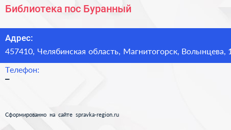 Библиотека, пос. Буранный по адресу 457410, Челябинская область, Магнитогорск, Волынцева, 1 в дальнейшем Организация, размещена в следующих категориях: