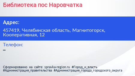 Библиотека, пос. Наровчатка по адресу 457419, Челябинская область, Магнитогорск, Кооперативная, 12 в дальнейшем Организация, размещена в следующих категориях: