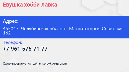 Евушка, хобби-лавка по адресу 455047, Челябинская область, Магнитогорск, Советская, 162 в дальнейшем Организация, размещена в следующих категориях: