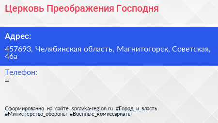 Церковь Преображения Господня по адресу 457693, Челябинская область, Магнитогорск, Советская, 46а в дальнейшем Организация, размещена в следующих категориях:
