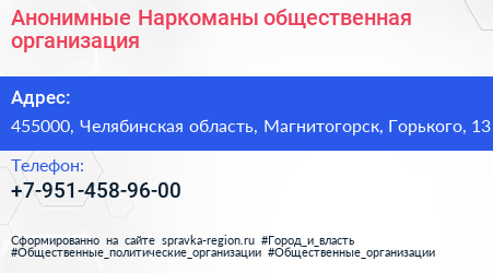 Анонимные Наркоманы, общественная организация по адресу 455000, Челябинская область, Магнитогорск, Горького, 13 в дальнейшем Организация, размещена в следующих категориях: