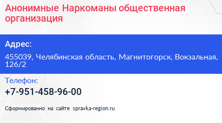 Анонимные Наркоманы, общественная организация по адресу 455039, Челябинская область, Магнитогорск, Вокзальная, 126/2 в дальнейшем Организация, размещена в следующих категориях: