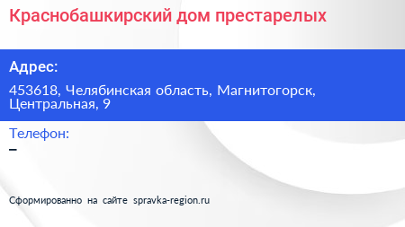 Краснобашкирский дом престарелых по адресу 453618, Челябинская область, Магнитогорск, Центральная, 9 в дальнейшем Организация, размещена в следующих категориях: