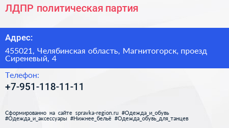 ЛДПР, политическая партия по адресу 455021, Челябинская область, Магнитогорск, проезд Сиреневый, 4 в дальнейшем Организация, размещена в следующих категориях: