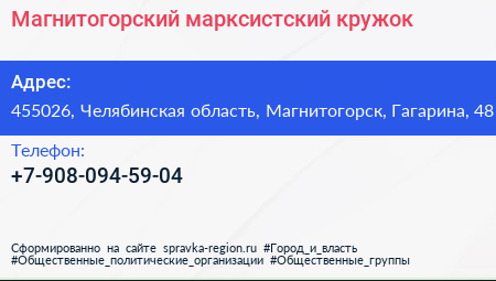 Магнитогорский марксистский кружок по адресу 455026, Челябинская область, Магнитогорск, Гагарина, 48 в дальнейшем Организация, размещена в следующих категориях: