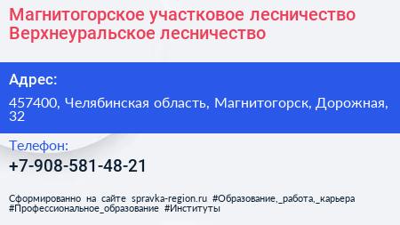 Магнитогорское участковое лесничество, Верхнеуральское лесничество по адресу 457400, Челябинская область, Магнитогорск, Дорожная, 32 в дальнейшем Организация, размещена в следующих категориях: