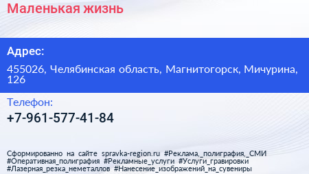 Маленькая жизнь по адресу 455026, Челябинская область, Магнитогорск, Мичурина, 126 в дальнейшем Организация, размещена в следующих категориях:
